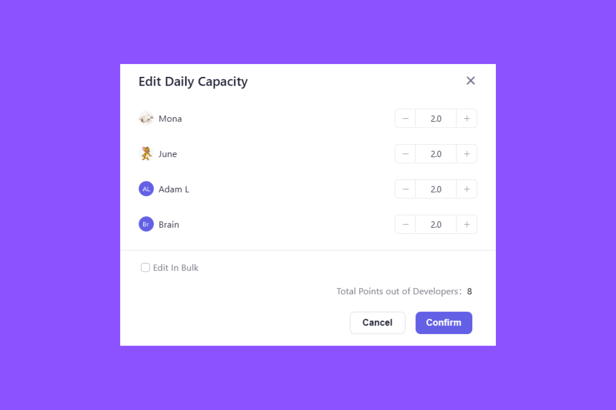 - When workload is counted in Man-hours, each member's capacity is preset at 8 hours and cannot be adjusted.