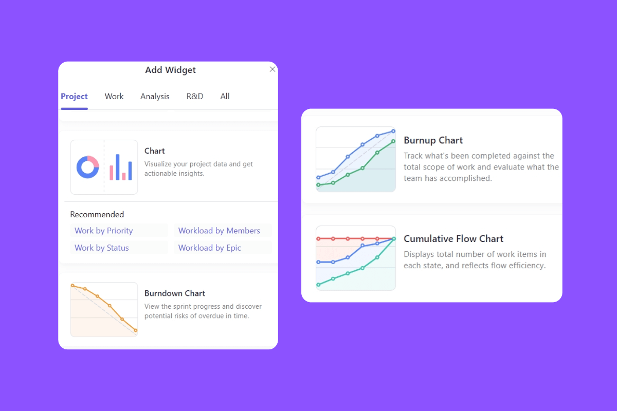 - Kanban Widget: Display project or sprint progress and create project reports with other widgets.
